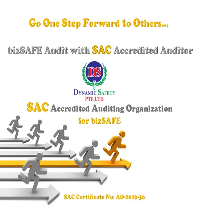 Dynamic Safety is now accredited by Singapore Accreditation Council (SAC) for bizSAFE Audit. Starting April 1, 2019, management system (SS506 part 1, OHSAS 18001, ISO 45001) without SAC accreditation for bizsafe star will be valid until March 12, 2021. After March 12, 2021 only ISO 45001 with SAC accreditation will be accepted. WSH Council will only accepts Risk Management Audits conducted by SA